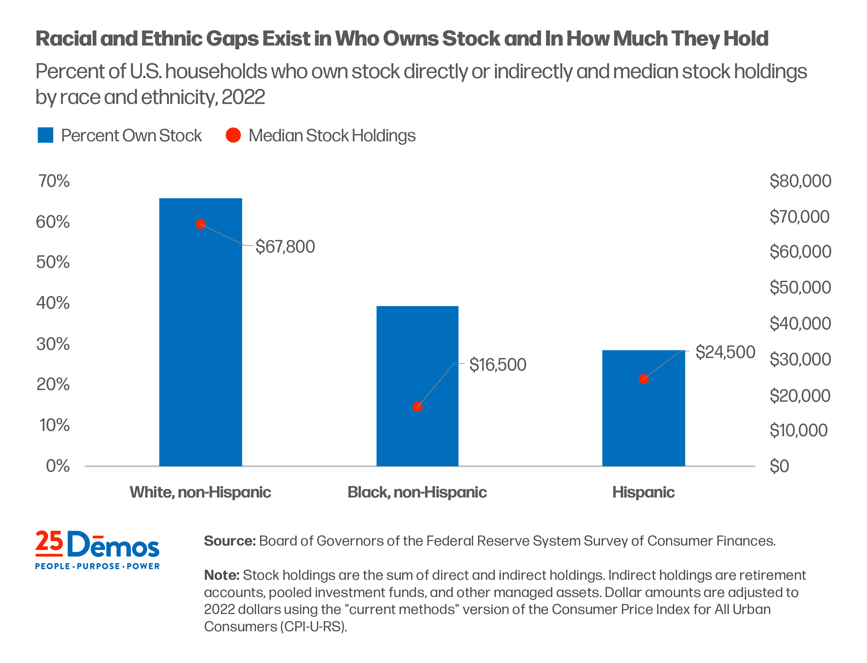 These inequities are not only about wealth. They are also deeply shaped by race. The figure below illustrates this: The bars show the share of households that own stock by race, and the dots represent the median value of their stock holdings. As the figure shows, white households are more likely to own stocks and to own them in significantly higher amounts. For example, 66 percent of white households hold stocks compared to just 28 percent of Hispanic households. Even among households that do own stock, the value of those holdings differs sharply by race. For example, the median value of stock holdings for white households is $67,800, while for Black households it is just $16,500. This means that stock market gains yield substantially larger windfalls for white families, widening divides that have been built and reinforced over generations.